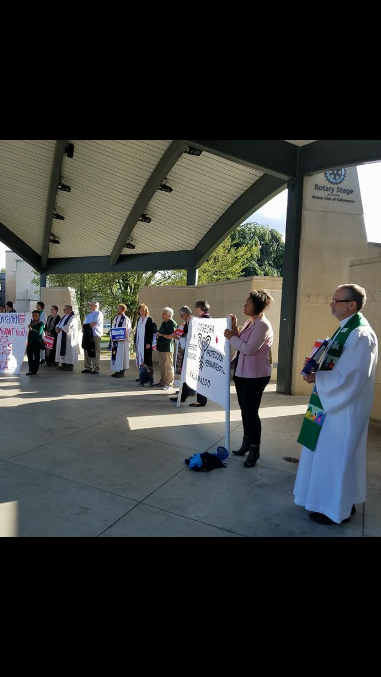 So, I thought I’m going to show this to the church council, that same DVD. The same shock. “Why is Obama at a U.C.C. meeting?” “Because he’s U.C.C. like we are.” “No, he’s not.” That inability—recognize reality, I mean, we’re not talking interpretations here. We’re talking straight-up facts. But boy, there are people—and I left that congregation—was serving a senior citizen community, and there are people that I dearly loved who would say the most racist things. And it was heartbreaking. And you can’t get in a fight with everybody you serve. I mean, how do you lift consciousness? How do you deal with these things? And there were things that I would say that—and Sundays in the sermons—the Sunday after Dylann Roof killed the nine parishioners in Charleston. There’s no way in the world I’m not going to deal with that. And people seemed to be okay with that. And I don’t know whether they didn’t always hear what I was saying, that it had come across okay because I was passionate about it? I think some people liked that I was passionate about it, and they didn’t necessarily get what I was saying. Never changed anything. Nobody ever had a conversion experience. But I couldn’t deal with the—all the racism that was present there. And I came back to Michigan for many reasons, but one of them was to—and I came to Kalamazoo, because I knew it was a progressive community where there were going to be people who I would feel comfortable with after living—after working in an area for six, seven years where I wasn’t comfortable at all with the attitudes of most of the people.